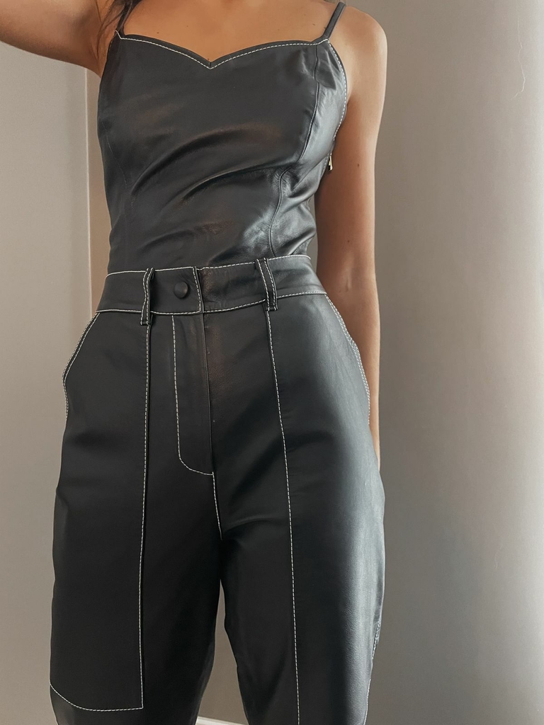 Calça com modelagem wide leg. Possui detalhes em pesponto de outro tom sobre toda a peça. Fechamento na parte da frente via zíper. Possui bolso faca aparente e funcional nas laterais e nas costas.