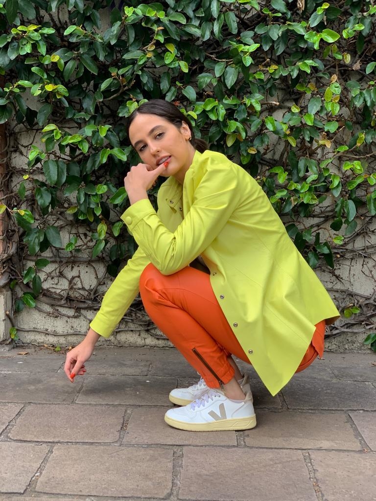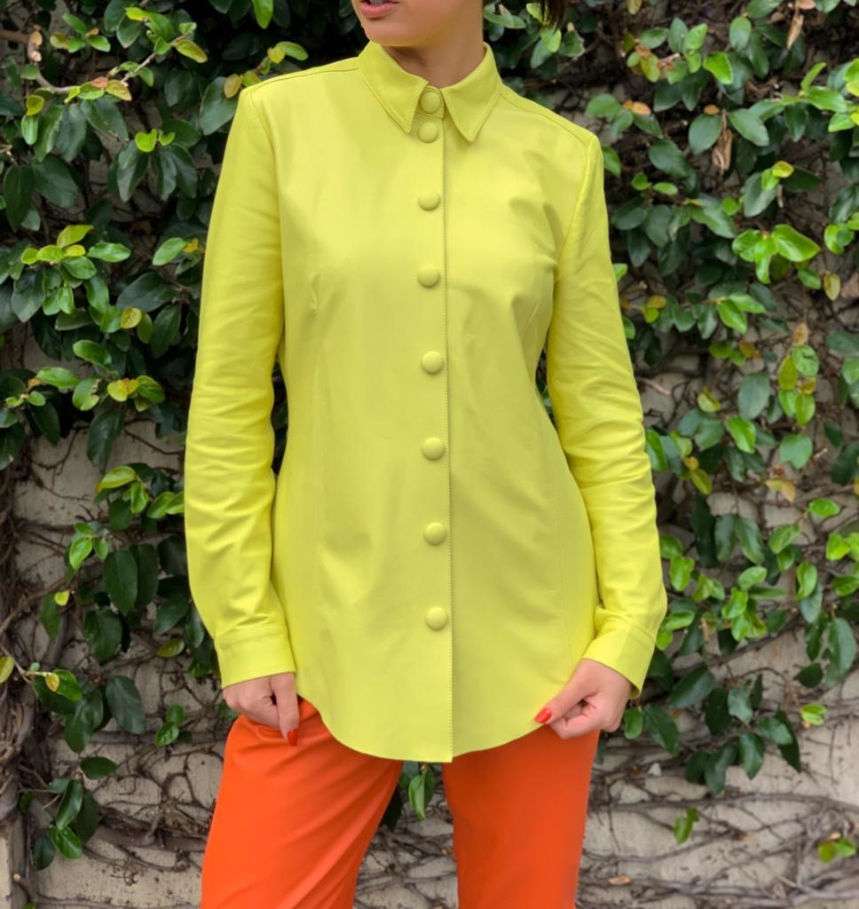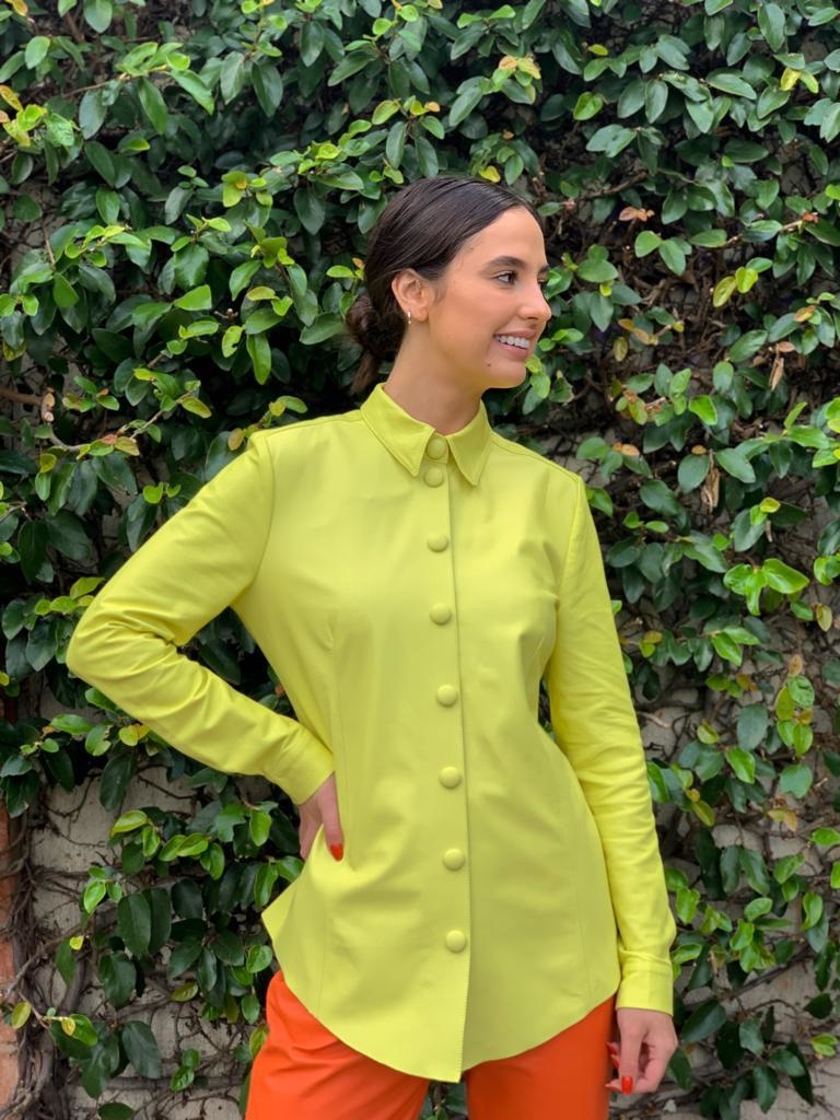 Camisa de manga longa com fechamento em botões de pressão forrados na cor da peça.